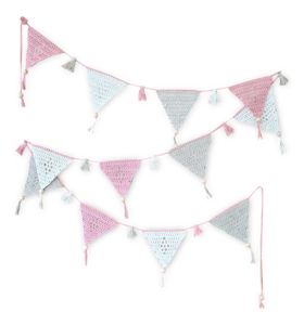 Het pakket bevat garen van 100% katoen. De vlaggenlijn bestaat uit 12 vlaggetjes en wordt ongeveer 270 cm lang.