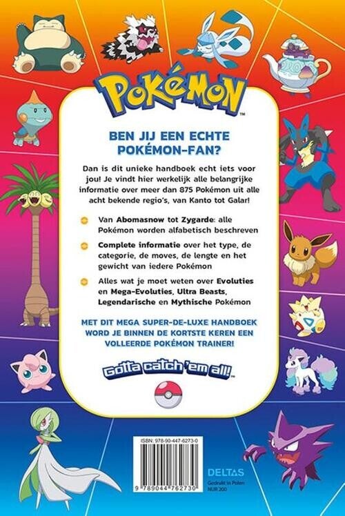 Ben jij een echte Pokémon-fan? Dan is dit unieke handboek echt iets voor jou! Je vindt hier werkelijk alle belangrijke informatie over meer dan 875 Pokémon uit alle acht bekende regio's, van Kanto tot Galar! - Van Abomasnow tot Zygarde: alle Pokémon worden alfabetisch beschreven. - Complete informatie over het type, de categorie, de moves, de lengte en het gewicht van iedere Pokémon - Alles wat je moet weten over Evoluties en Mega-Evoluties, Ultra Beasts, Legendarische en Mythische Pokémon Met dit mega super-de-luxe handboek word je binnen de kortste keren een volleerde Pokémon trainer! Prachtige hardback uitgave met 2 leeslintjes.